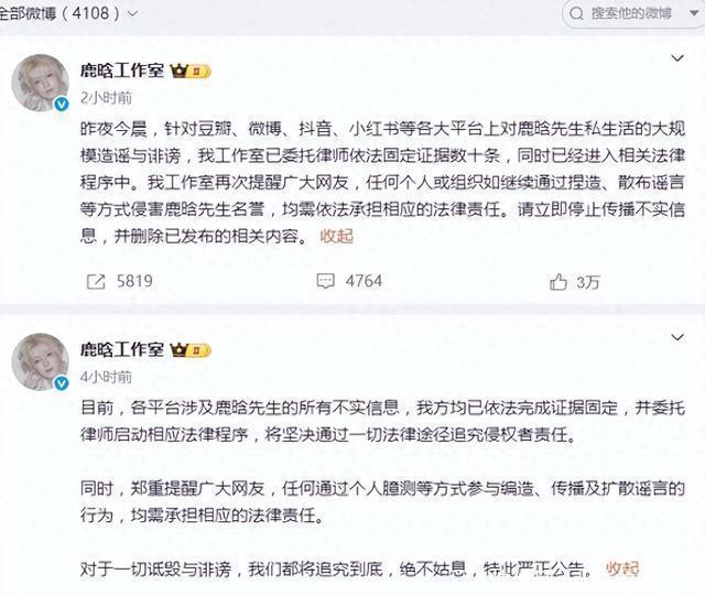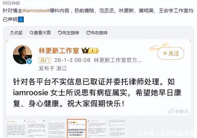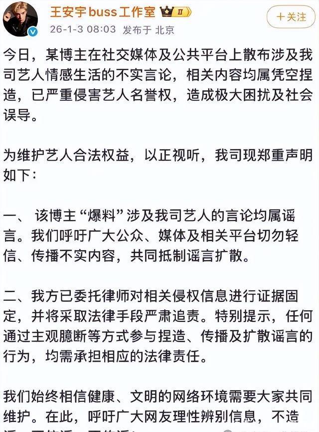 深夜批量造谣引爆全网,鹿晗等艺人成目标 这场风波的起点,是1月2日深夜的一场“地毯式爆料”。账号“司晓迪(iamrooise)”突然在多个社交平台同步发文,开启了对多位男艺人的“点名式爆料”。 根据网友截图,该账号不仅直接点名鹿晗、林更新、檀健次等多位当红男艺人,声称与他们存在恋爱等私密关系,还晒出与范丞丞的聚会照片,刻意引导公众联想“私密关联”。更离谱的是,她还在粉丝群里额外爆料“王安宇与关晓彤正在恋爱”,把无关艺人也拉进舆论漩涡。 由于涉及的艺人都是流量较高的公众人物,再加上“私密关系”“合照实锤”等刺激性表述,爆料内容在深夜迅速扩散。微博、抖音等平台上,相关讨论刷屏,不少不明真相的网友跟风转发,甚至有人开始恶意揣测艺人私生活,#疑似鹿晗私密合照曝光#等不实话题也一度被刷上热搜前排,给艺人声誉带来极大影响。 硬刚到底!鹿晗工作室连发两条声明,维权态度零含糊 面对愈演愈烈的谣言,鹿晗工作室没有选择“冷处理”,而是以最快速度亮出态度,维权操作堪称“教科书级别”: 第一波回应(1月3日凌晨):率先发文澄清,明确表示“各平台涉及鹿晗先生的所有不实信息,均已依法完成证据固定,并委托律师启动相应法律程序”,直接把“维权”的信号拉满,给谣言泼了第一盆冷水。 第二波回应(1月3日早晨):再次加码声明,详细说明“已固定数十条造谣证据”,强调“造谣行为已构成诽谤”,并严肃提醒“任何个人或组织继续传播不实信息,均需依法承担相应法律责任”,同时呼吁网友“立即删除相关内容”,态度强硬且明确。 值得一提的是,鹿晗并非唯一被针对的艺人,此次爆料中被点名的范丞丞、王安宇等艺人的工作室,也同步开启了维权模式。范丞丞工作室发文指责爆料者“偷拍内容+添油加醋混淆视听”,已连夜固定证据起草法律文件;王安宇工作室则直接否认“与关晓彤恋爱”的不实言论,称相关内容“纯属凭空捏造”。多位艺人集体硬刚,让这场“批量造谣”的闹剧迅速失去市场。