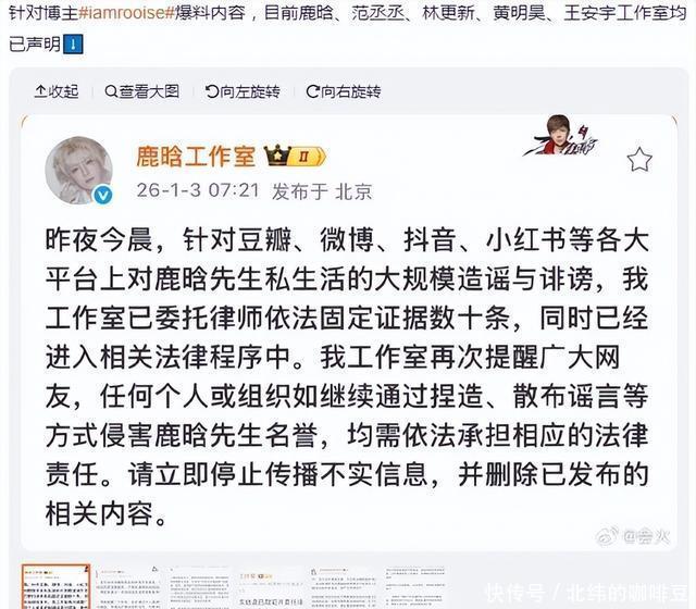 账号“司晓迪(iamrooise)”多个社交平台同步发文,鹿晗方硬刚造谣者!深夜连发两条声明辟谣网传合照,已固定证据启动法律程序 2026开年的娱乐圈,刚送走童锦程的私生子风波,又被一场批量造谣搅得鸡犬不宁! 1月3日一早,#鹿晗方辟谣网传合照#话题直接冲上热搜第二,阅读量半天狂飙2.8亿。原因是前一晚深夜到凌晨,某账号突然在豆瓣、微博等多平台“爆猛料”,点名鹿晗、范丞丞等多位男艺人,声称与他们存在私密关系,还晒出所谓“聚会合照”混淆视听,瞬间让全网吃瓜群众炸开了锅。 就在谣言发酵的关键时刻,鹿晗工作室没做任何含糊,直接开启“硬刚模式”——深夜到清晨连发两条声明辟谣,不仅明确否认所有不实信息,还高调宣布已固定数十条证据、启动法律程序,喊话造谣者“立即停止传播,否则必担法律责任”。这波干脆利落的维权操作,让舆论瞬间反转。今天就把这场“批量造谣VS集体维权”的大戏,扒得明明白白!